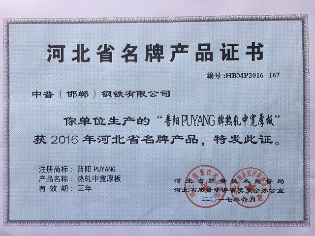 我公司“熱軋中寬厚板”榮獲“2016年河北省名牌產(chǎn)品”稱號