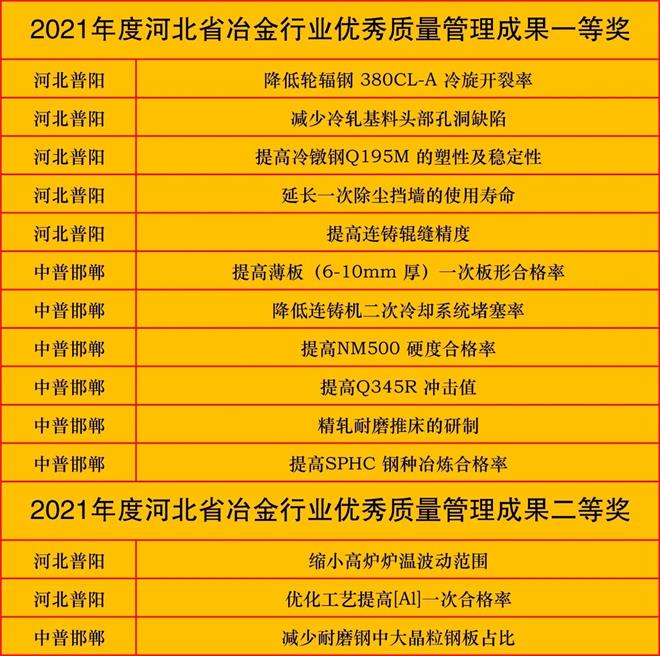 自2012年起,河北普陽鋼鐵集團導入QC(質(zhì)量控制的英文縮寫)管理方法。截至目前,共94項成果在河北省冶金行業(yè)質(zhì)量管理優(yōu)秀成果發(fā)布會獲獎,其中獲特等獎3項(2017年設立),一等獎74項,二等獎17項,并連續(xù)多年榮獲“河北省冶金行業(yè)質(zhì)量管理小組活動優(yōu)秀企業(yè)”的榮譽稱號。