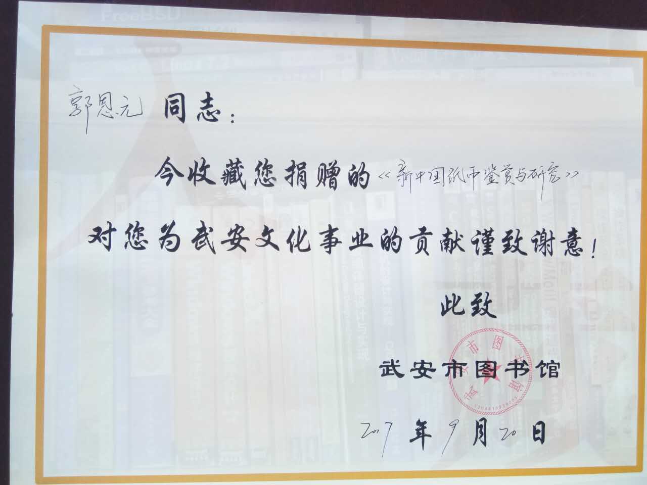 近日,由我公司董事長(zhǎng)郭恩元牽頭編纂的《新中國(guó)紙幣鑒賞與研究》一書(shū),被武安市圖書(shū)館收藏。
