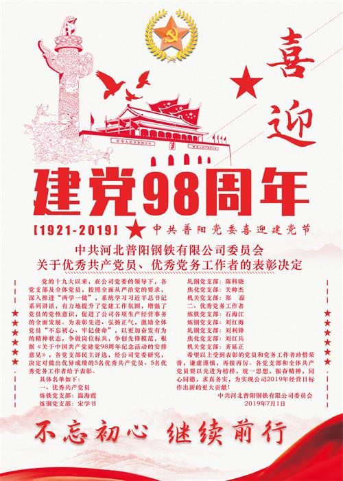 黨的十九大以來,在公司黨委的領(lǐng)導(dǎo)下,各黨支部及全體黨員,按照全面從嚴(yán)治黨的要求,深入推進(jìn)“兩學(xué)一做”,系統(tǒng)學(xué)習(xí)習(xí)近平總書記系列講話,有力地提升了黨建工作氛圍,增強(qiáng)了黨員的黨性意識,促進(jìn)了公司各項生產(chǎn)經(jīng)營事務(wù)的全面發(fā)展。為表彰先進(jìn)、弘揚(yáng)正氣,激勵全體黨員“不忘初心、牢記使命”,以更加奮發(fā)有為的精神狀態(tài),爭做崗位標(biāo)兵,爭創(chuàng)先鋒模范,根據(jù)《關(guān)于中國共產(chǎn)黨建黨98周年紀(jì)念活動的安排意見》,各黨支部民主評選,經(jīng)公司黨委研究,決定對做出優(yōu)異成績的5名優(yōu)秀共產(chǎn)黨員、5名優(yōu)秀黨務(wù)工作者給予表彰。