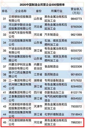 河北普陽鋼鐵有限公司以786億元營業(yè)收入榮列2020中國民營企業(yè)500強第86位,較去年提升30個位次;中國制造業(yè)民營企業(yè)500強第45位,較去年提升15個位次;整體排名居邯鄲民營鋼鐵企業(yè)之首,成功入圍中國民營鋼鐵企業(yè)前十強!